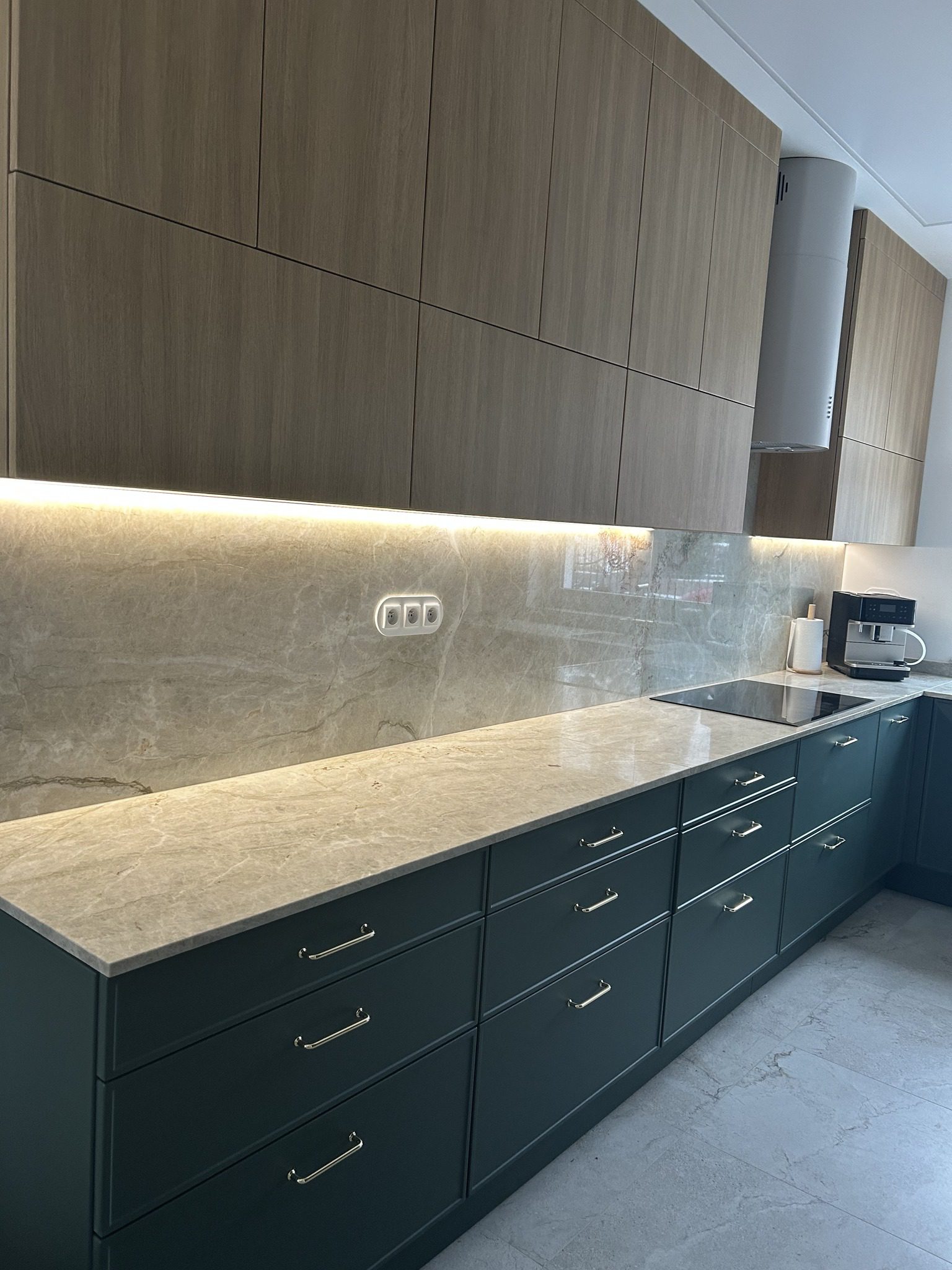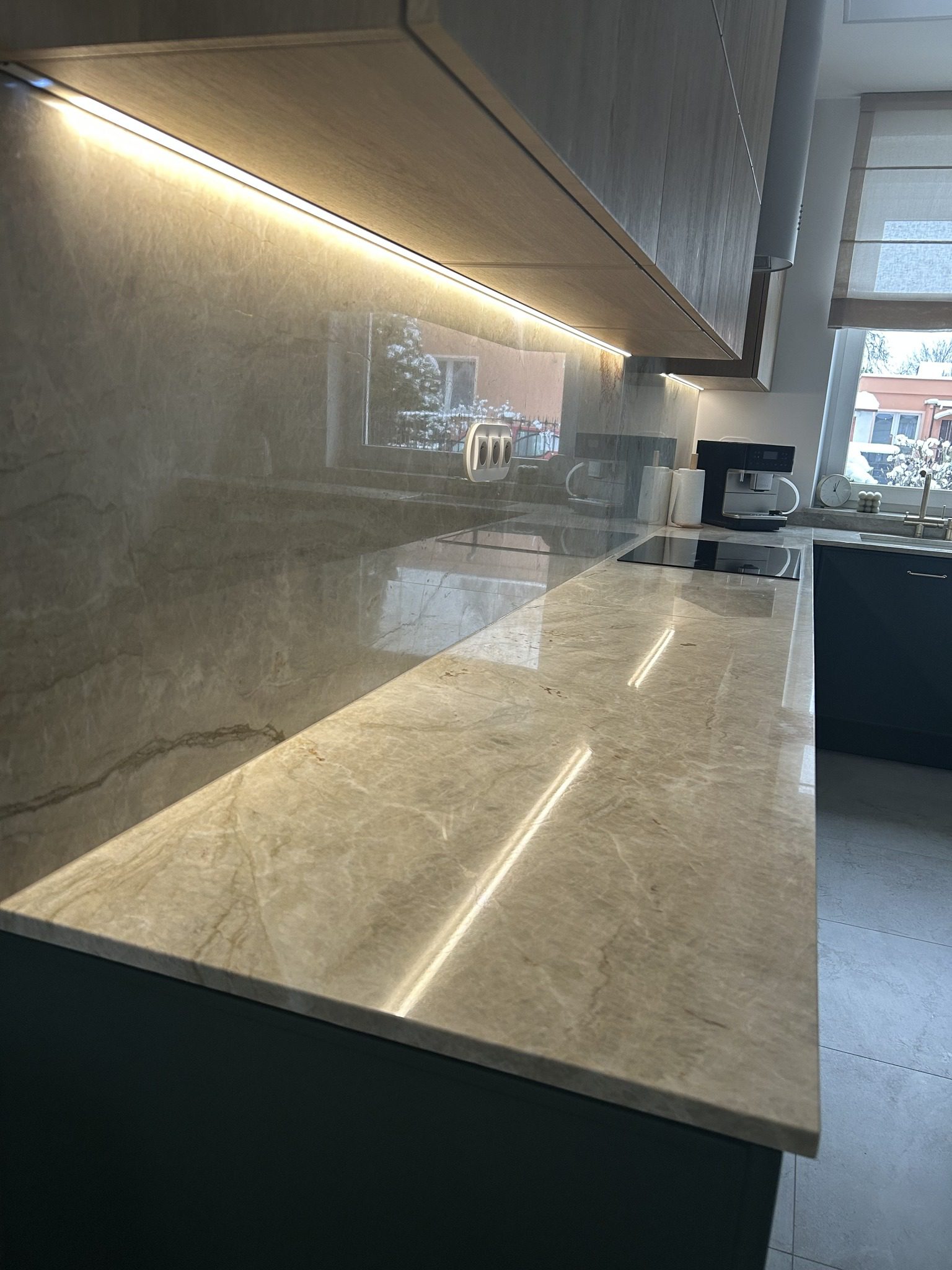 Jak wygląda kwarcyt Taj Mahal? Oferowany blat charakteryzuje się subtelną, kremowo-beżową bazą, przez którą przenikają delikatne, ciepłe żyły w odcieniach złota, miedzi i szarości. Dzięki wykończeniu na wysoki połysk (poler), powierzchnia idealnie odbija światło (co doskonale widać przy oświetleniu podszafkowym), optycznie powiększając przestrzeń i nadając jej niezwykłej elegancji.