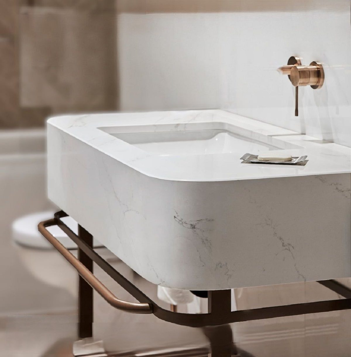Chcielibyśmy zaprezentować Wam naszą nowość – blaty łazienkowe z konglomeratu kwarcowego Silestone Calacatta Gold.