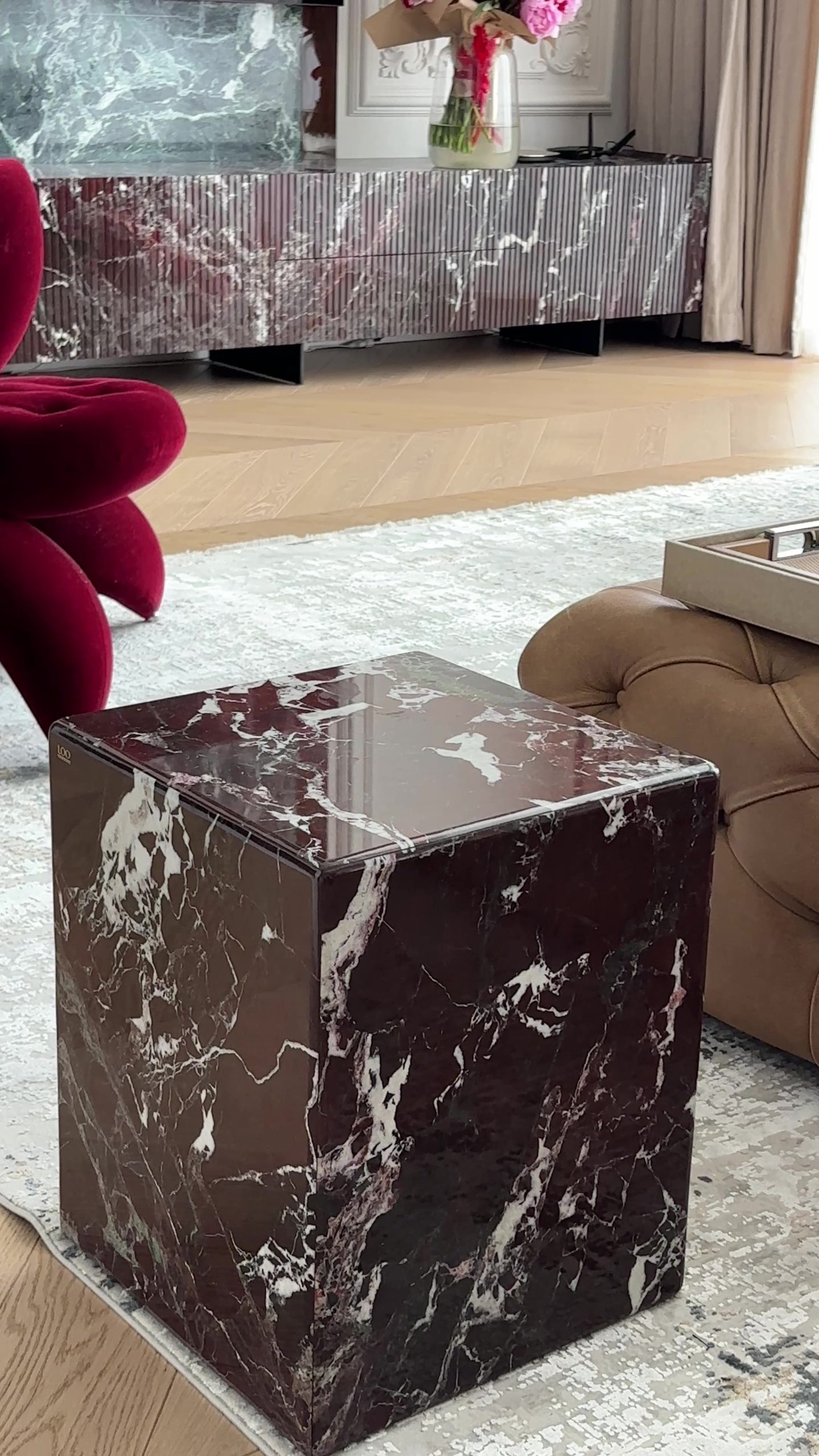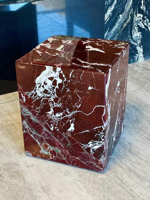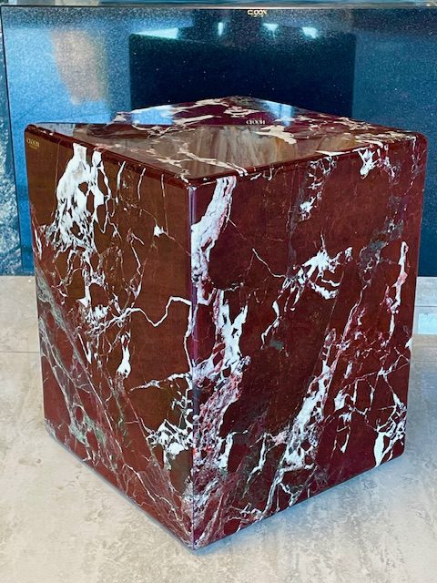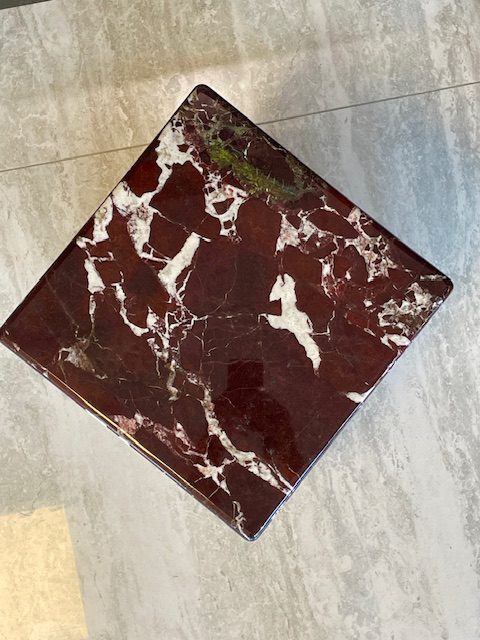 Kamienny stolik kawowy z marmuru naturalnego. Wyjątkowy stolik wykonany z prawdziwego marmuru Roso Levante to kwintesencja luksusu i ponadczasowego stylu. Każdy egzemplarz powstaje ręcznie, co sprawia, że jest unikatowy – naturalne użylenia kamienia tworzą niepowtarzalny rysunek.